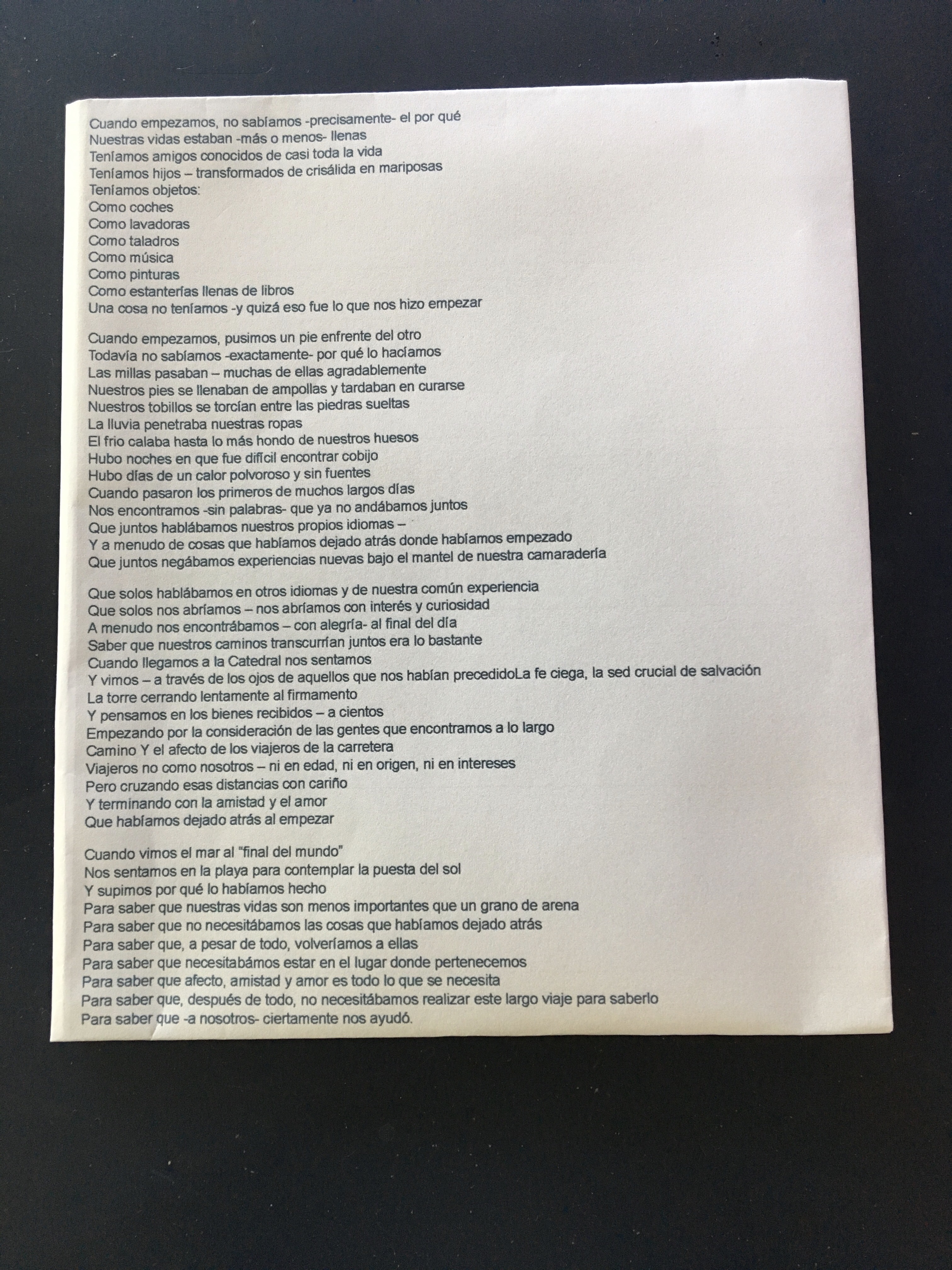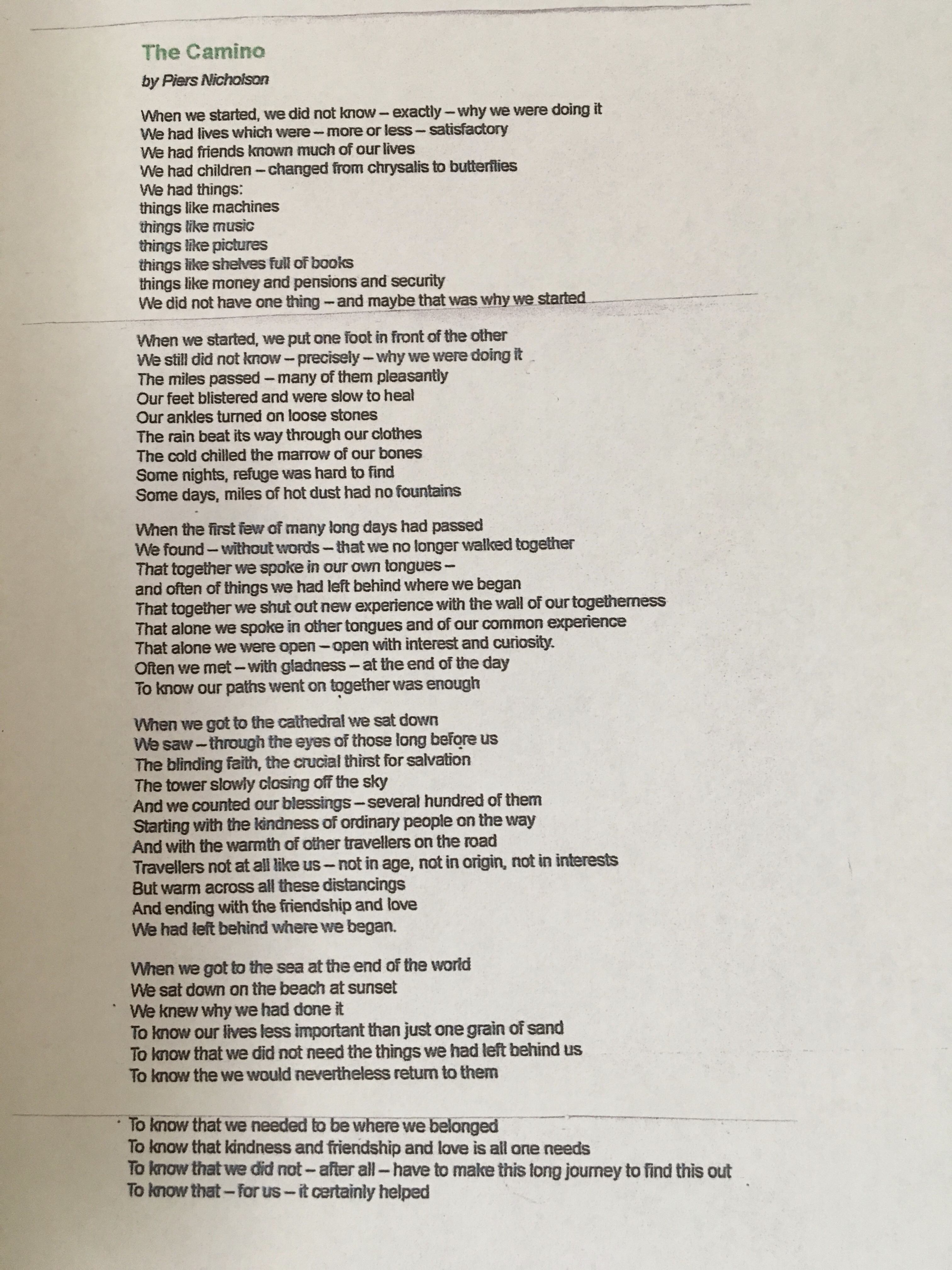 (On the Camino the normal socio-economic barriers don’t exist – nobody cares what work you do, if you are rich or poor, old or young – the only thing that matters is your openness of heart.)