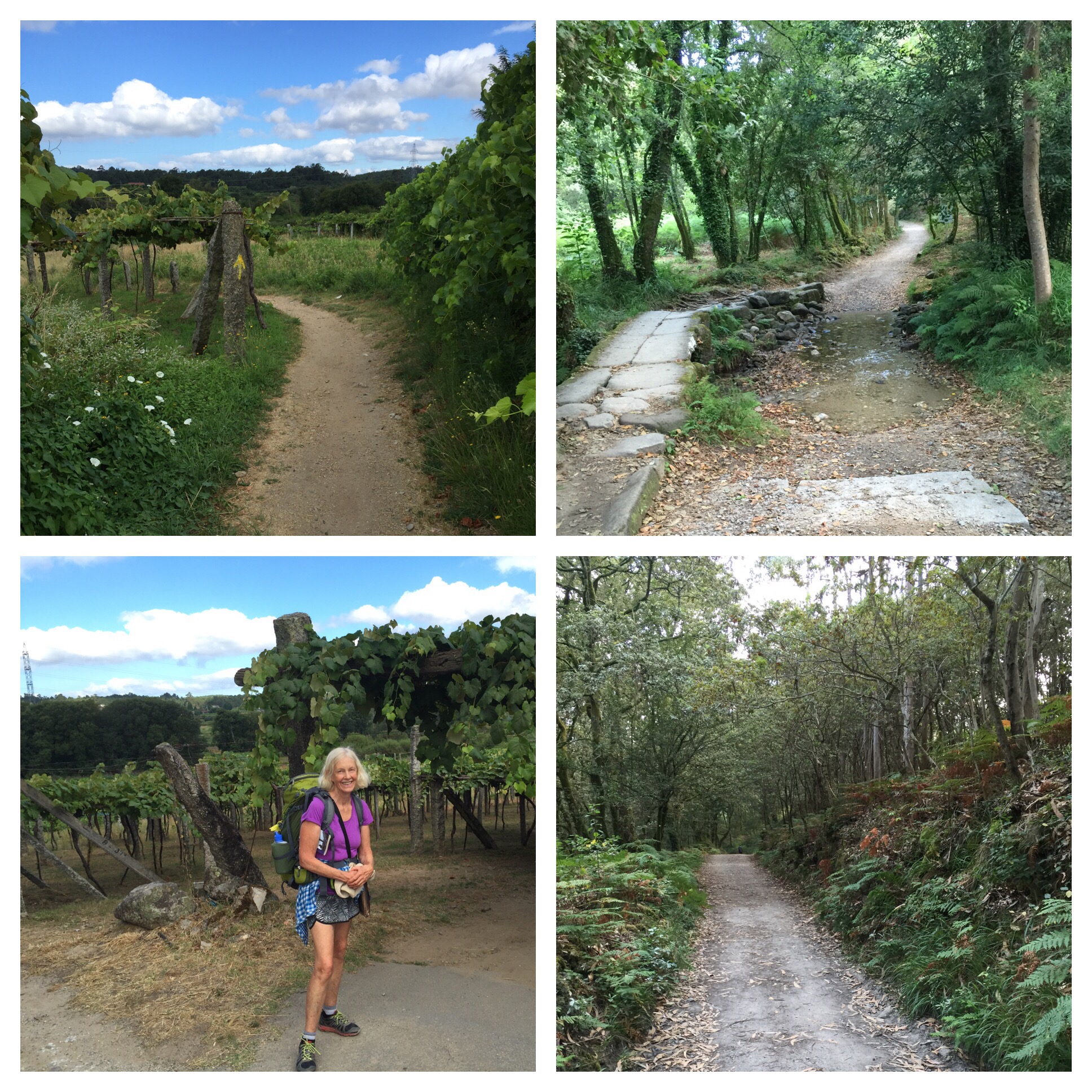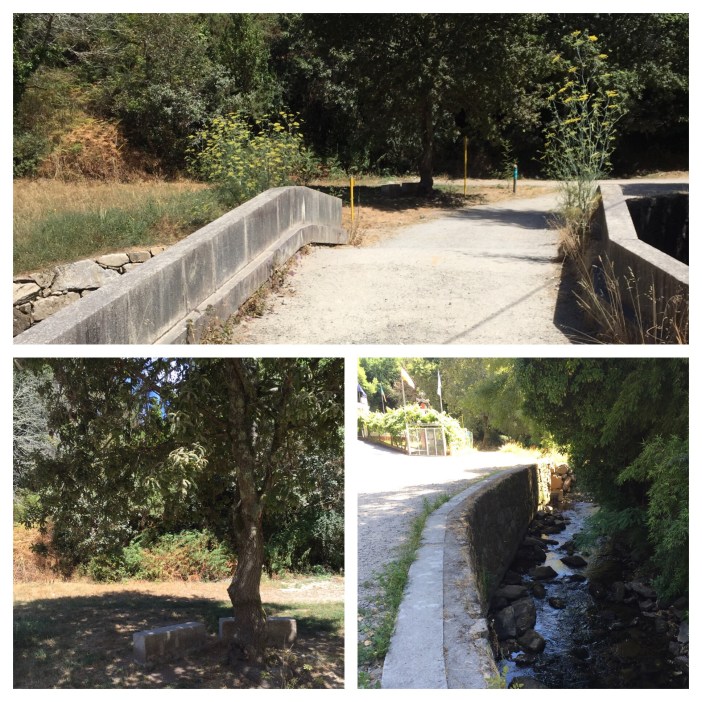 Photos – Walking under the grape vines – The Camino followed the railway for a while before veering off through the countryside – This is typical of the many public places for washing clothes – A path across a stream, perfect for a rest stop!