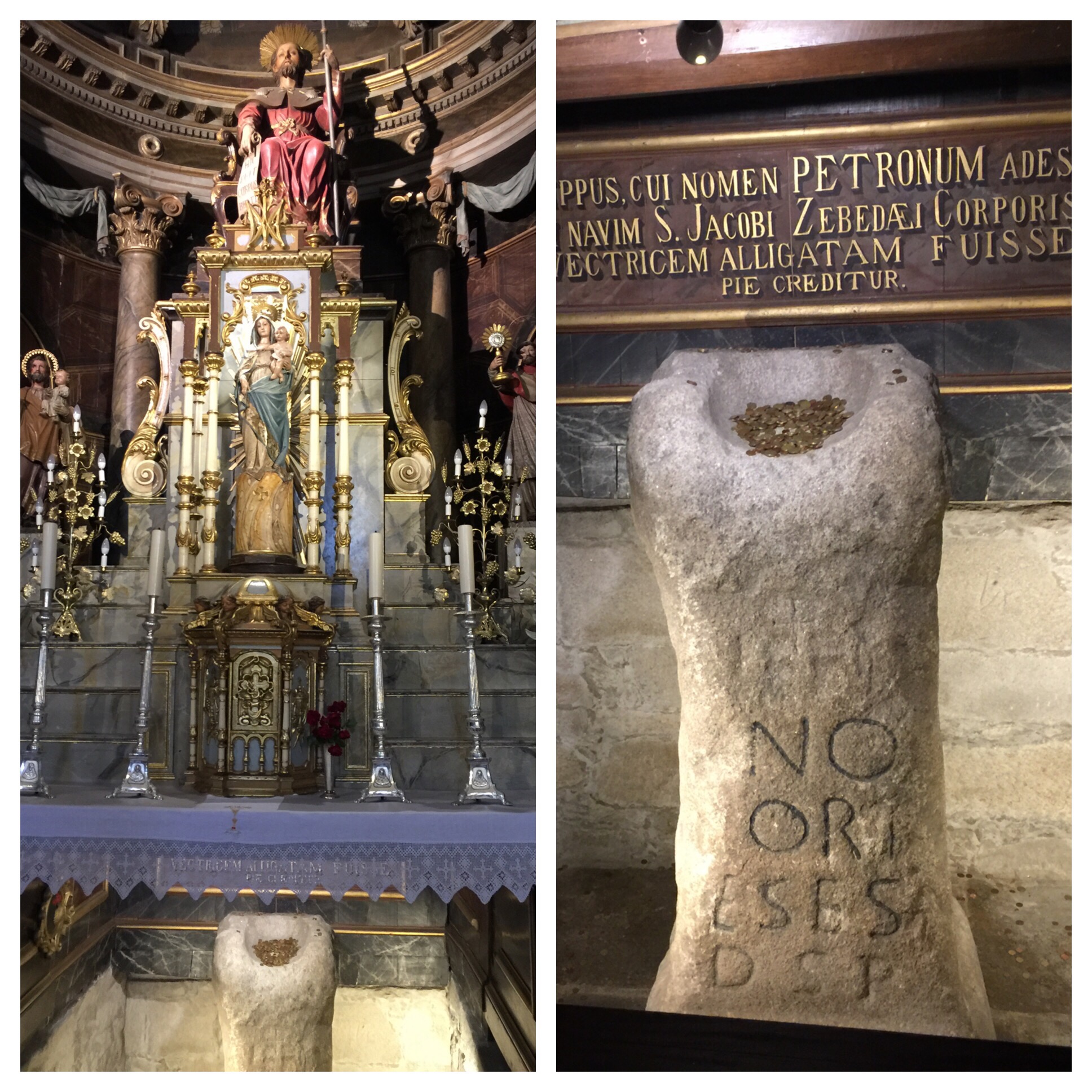 Below is the church of St. James – the Igrexa de Santiago. The legend is that this is where the boat carrying the body of James the Apostle was moored by the river bank. The church was built over the site and the stone underneath the altar is supposedly the mooring post to which was boat was tied. It was also this stone (O Pedron) from which the town took its name.
