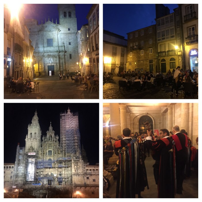 Santiago at night (the top two photos are of the square by my room and the bottom photos are of the lighted cathedral and the troubadours performing under the arches of the cathedral plaza.)