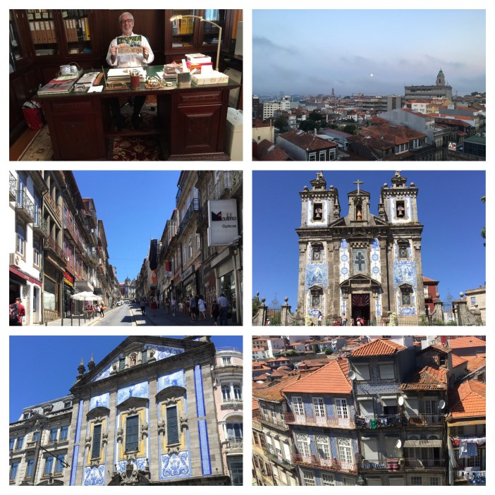 Porto – time to relax and recover while I stayed in Hamid and Isti’s wonderful apartment – with great conversations and wonderful Portuguese meals. The following photos show Hamid in his office (holding the Italian gold medal award for his company’s olive oil!) and then the view out of my window. The full moon in the photo means that I am halfway through my Camino – I started on the day of the new moon. The other photos give an impression of Porto – with the wonderful blue tiles adorning the facades of important buildings.I wanted to conserve every scrap of energy so,in fact, I left the apartment only to eat out with Hamid or to walk to Porto Cathedral (where I got the required stamp for my credenciale and met for coffee with Johanna (one of our pilgrim band before Porto – who was a day behind me).